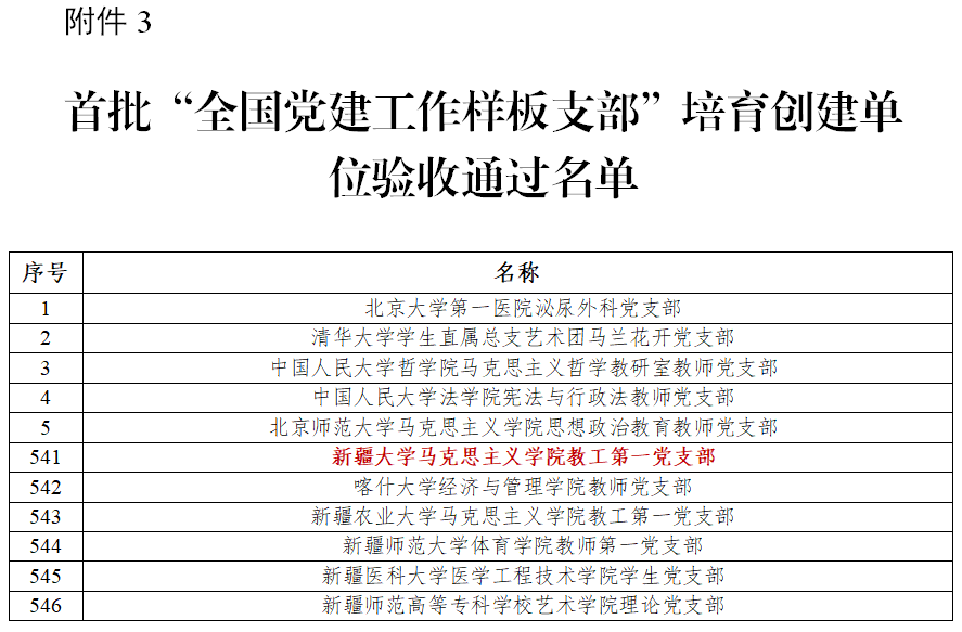 2018年12月,教育部办公厅印发《关于公布首批全国党建工作示范高校、标杆院系、样板支部培育创建单位名单的通知》(教思政厅函〔2018〕43号),确定10个高校党委、100个院系党组织、559个党支部为培育创建单位。两年建设期内,大部分单位按期完成建设任务,发挥引领示范作用,带动高校党建工作质量整体提升。经创建单位对标自查总结、上级党组织满意度测评、属地教育工委把关复核、教育部思想政治工作司审查,拟认定10个高校党委、98个院系党组织、551个党支部通过验收。