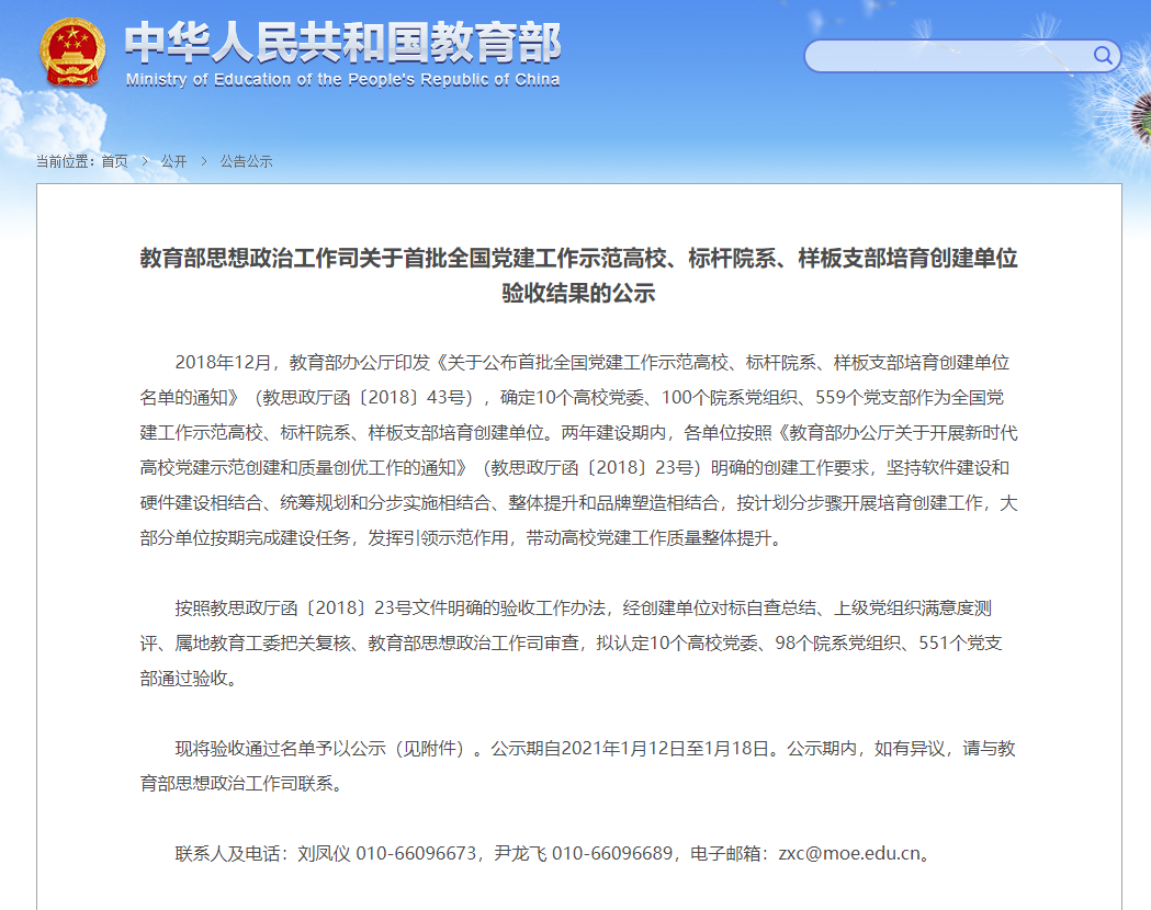 1月12日,教育部思想政治工作司关于首批全国党建工作示范高校、标杆院系、样板支部培育创建单位验收结果公示,其中,英国365公司官网政治与公共管理学院党委、马克思主义学院教工第一党支部通过首批“全国高校党建标杆院系”“全国党建工作样板支部”培育创建单位验收。