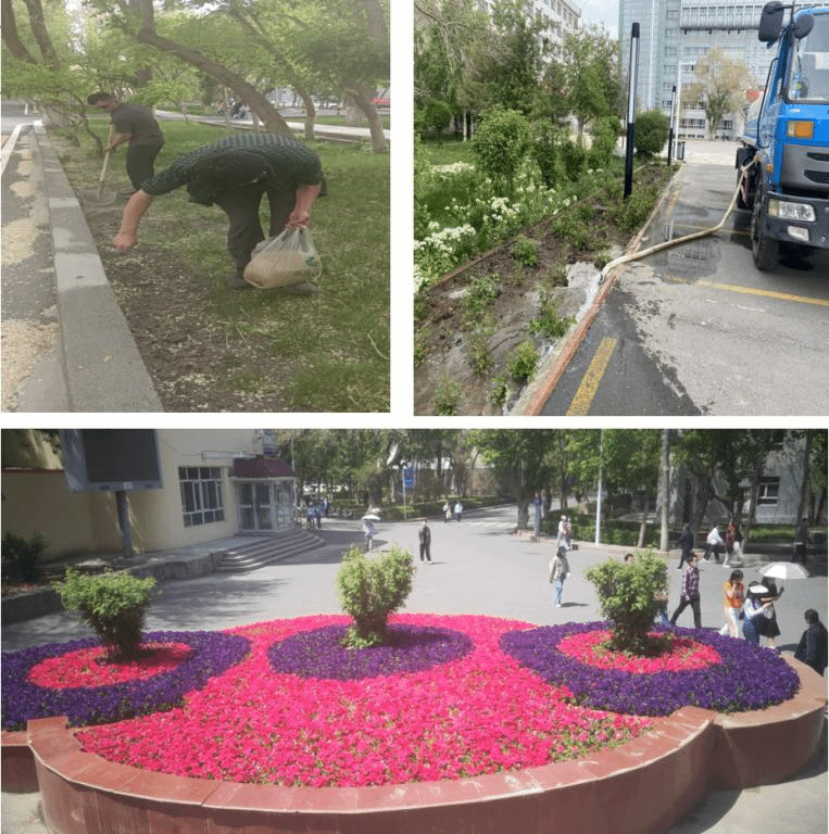 在第一餐厅、红湖周边景观花坛摆放矮牵牛花23000棵,增添校园色彩。种植多种绿植,提升绿地景观:在老行政楼、图书馆等地花池内种植野花组合(宿根)1000多平米,在绿篱带补植水蜡13000棵,平整多处地块种植红叶李200棵、榆叶梅190棵、月季700棵以及蜀葵近1000平米。
