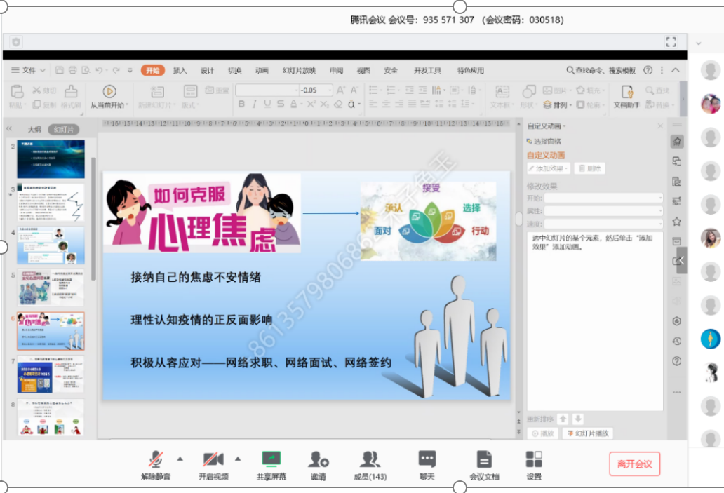 会议就毕业生提出的与原用人单位解约、档案转递、如何有效获取求职信息等就业问题进行了在线解答,对毕业生疫情期间心理问题进行疏导,要求毕业生从权威渠道获取疫情信息,积极接纳焦虑不安的情绪,理性认识疫情的正反面影响,从容应对网络求职、面试和签约。