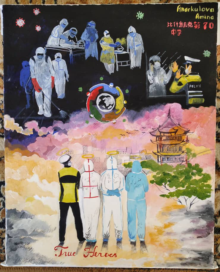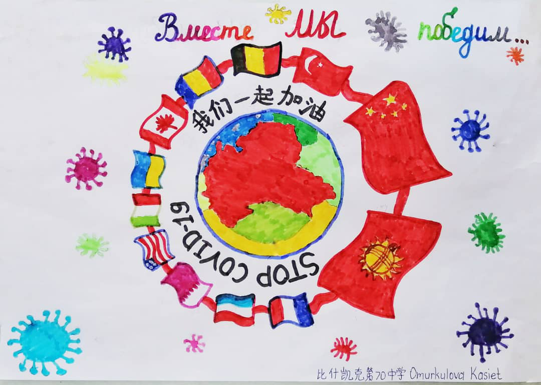 参赛选手围绕共同抗击新冠疫情,用画笔展示他们在孔子学院学习过程中对汉语、对中国文化的理解和认识。有的小朋友画了中国龙表达他们对战胜疫情的信心,更多地参赛选手则用画笔表达了各国人民联合起来共同抗击疫情的愿望。通过专家评审,来自俄罗斯新西伯利亚国立大学孔子学院学员布尔纳科娃•韦纳里耶夫娜题为《中国力量抗击新冠病毒》获得了一等奖,来自吉尔吉斯斯坦比什凯克国立大学孔子学院阿丽比娜·卡斯莫娃等八名学员分别获得了二等奖和三等奖。学校将选择部分获奖作品制作环保帆布袋,与防疫物资一起寄送给境外的孔子学院学生。