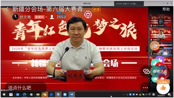 9月1日上午,由教育部主办、自治区教育厅承办、各区属高校协办的第六届中国国际“互联网+”大学生创新创业大赛“青年红色筑梦之旅”新疆维吾尔自治区10个未摘帽贫困县全国线上对接活动成功举办。活动采取钉钉直播的形式,并设立七个分会与主会场同步进行,4000余名师生参与并实时互动。自治区教育厅党组成员、副厅长刘玉光及各高校负责创新创业的分管领导参加了此次活动。