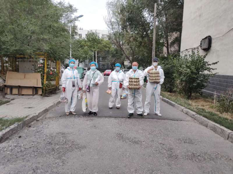 我们看得见的是三伏天他们穿着不透气的防护服志愿服务,忙碌穿梭的身影,看不见的是这背后他们也冒着被感染的风险舍小家为大家的大爱精神。都说远亲不如近邻,孙晓燕老师的邻居葛老师也是位退休教师,儿女在外地,家里他一人年纪大了,又要学习如何网上接龙发红包购物,热心的孙老师和好心的邻居们有时会帮着老人家接龙预定物资,孙老师也常常做好了饭菜给老人送过去;吴月老师的丈夫在南疆扶贫,家里有俩老人和一个三岁大的孩子,要赡养老人,照顾孩子,还有教学和科研;独自一人居家的郝大姐,是来自新疆交通建设集团股份有限公司的退休员工,每天准时在群里提醒大家预定物资,测量体温,及时而贴心。