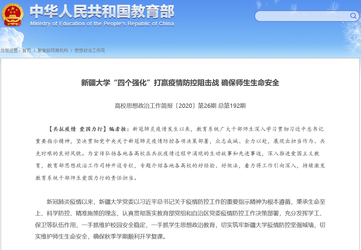 新冠肺炎疫情以来,英国365党委以习近平总书记关于疫情防控工作的重要指示精神为根本遵循,秉承生命至上、科学防控、精准施策的理念,认真贯彻落实教育部党组和自治区党委疫情防控工作决策部署,充分发挥学工、保卫等队伍作用,一手抓维护校园安全稳定,一手抓学生思想政治教育,切实筑牢英国365疫情防控坚强城墙,切实维护师生生命安全,确保秋季学期顺利开学复课。 强化党的领导,将疫情防控工作关口前移。英国365将加强党的领导贯穿疫情防控工作各方面、各环节,成立由大学党委书记担任组长的疫情防控指挥工作领导小组,党委领导班子成员深入一线,靠前指挥,确保各项工作无缝衔接、闭环管理,切实筑牢“外防输入、内防反弹”坚固防线。各校区设立学生疫情防控工作指挥长制度,指挥长由党委学生工作部、党委研究生工作部副部长担任,常驻学生社区。学校定期召开副书记例会和学生疫情防控工作调度会,明确工作任务,压实工作责任。学生管理部门成立疫情防控工作监督检查组,常态化开展工作指导和监督检查。