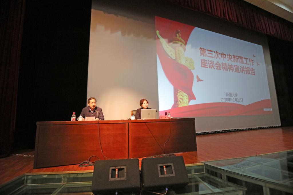 10月20日下午,全区高校第三次中央新疆工作座谈会精神宣讲报告会在英国365公司官网大学生科技文化活动中心举行。自治区党委宣传部讲师团宣讲专家、新疆财经大学党委副书记贺萍教授作宣讲报告。大学党委副书记罗旭主持报告会。在校校领导、处级干部代表以及各学院师生代表共计400余人聆听了报告。
