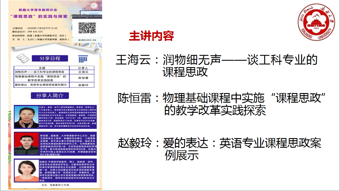 赵毅玲老师结合《爱的表达:英语专业课程思政案例展示》这一话题,讲述了她和团队通过外国语学院的发展沿革、新疆红色旅游资源、中国优秀传统文化、新时代中国青年这四个模块来构建英语专业课程思政,通过让学生制作3分钟的英文短片纪念祖国成立70周年,暑期制作英文短视频介绍自己的家乡,为红湖拍照赋诗,以疫情为主题制作海报等方式将爱祖国、爱家乡、爱校园的情怀融入英语专业课教学中,将灌输与渗透相结合、隐形与显性教育相结合,真正体现课程思政的丰富内涵。