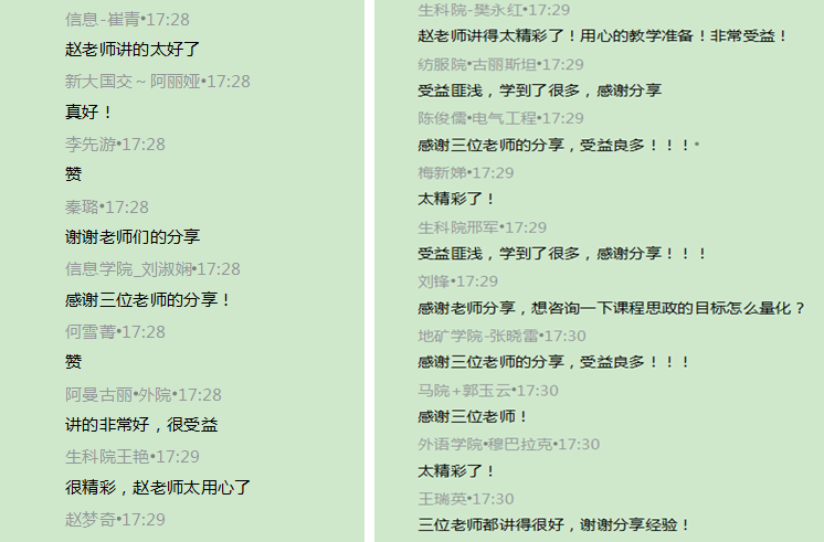 三位老师结束分享后和线上的老师们进行了交流互动,聊天区对本次课程好评不断:“三位老师讲得都很好,学到了很多实用的技巧和方法,一定要尝试将学到的内容运用到自己的教学中”。