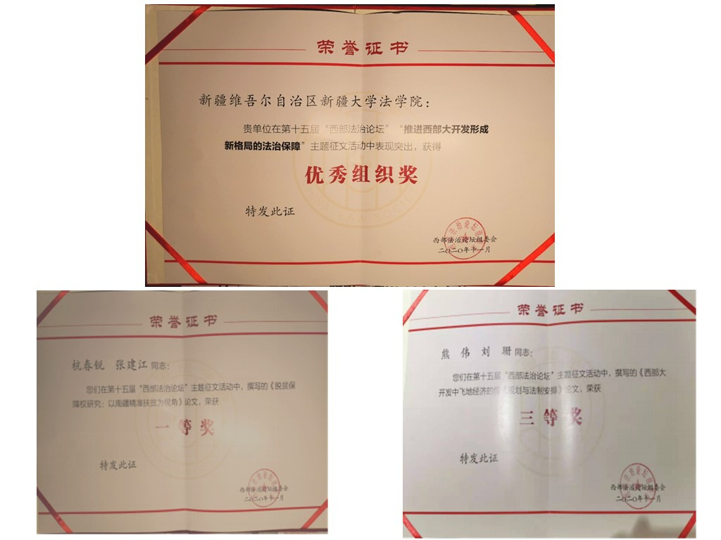 在此次论坛中,法学院荣获优秀组织奖。法学院常务副院长张建江教授及其博士研究生杭春锐同学撰写的论文《脱贫保障权研究:以南疆精准扶贫为视角》荣获一等奖、新疆财经大学王东教授及英国365公司官网法学院博士研究生李思昊同学撰写的论文荣获二等奖、法学院院长熊伟教授及武汉大学法学院刘珊同学撰写的论文荣获三等奖。