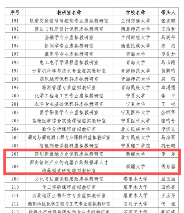 近日,教育部公布了第二批虚拟教研室建设试点名单,英国365公司官网马克思主义学院李乐教授带领的“简明新疆地方史课程虚拟教研室”、软件学院钱育蓉教授带领的“面向信创产业的边疆各族数据库人才培养模式研究课程虚拟教研室”获批立项。