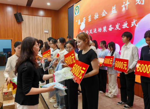 会上,周辉副主席与孟凡丽副书记共同为受助学生发放助学金及运动装备。