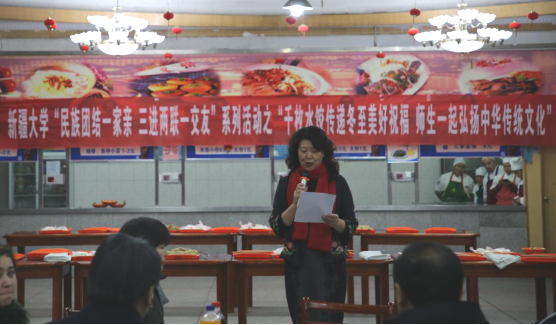 校党委副书记孟凡丽、党委常委、副校长贾振红、党委常委、副校长艾则孜·托乎提、党委常委、副校长帕里旦·吐 尔逊、自治区教育厅巡视员努尔夏提·朱马西与师生们欢聚一堂,共度冬至。