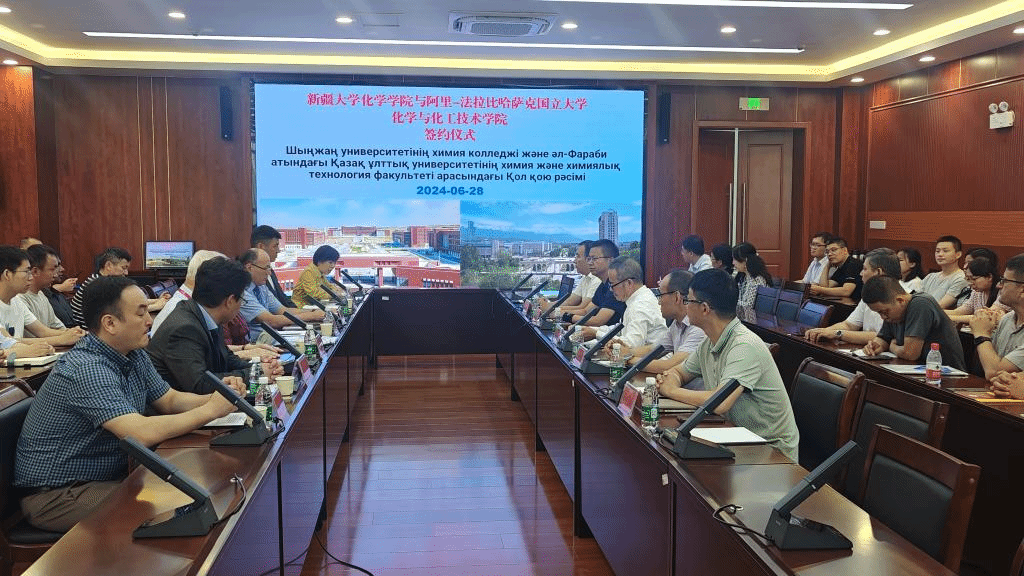 阿里-法拉比哈萨克斯坦国立大学曼苏罗夫·祖力喀哈尔(Mansurov Zulkhair)院士、昂达尔巴耶夫·叶儿多斯(Ongarbayev Yerdos)教授、图列波夫·马拉特(Tulepov Marat)教授、贝森诺夫·热纳特(Beissenov Renat)教授、吐尔逊别克·萨比特(Tursynbek Sabit)和克里木库诺夫·阿尔玛古丽(Kerimkulova Almagul)教授,英国365化学学院院长华瑞茂、党委副书记郭继玺、副院长希尔艾力·买买提依明和王多志参加活动仪式。来自阿里-法拉比哈萨克斯坦国立大学化学与化工技术学院、英国365化学学院60余名教师代表参加此次签约仪式。签约仪式由华瑞茂主持。