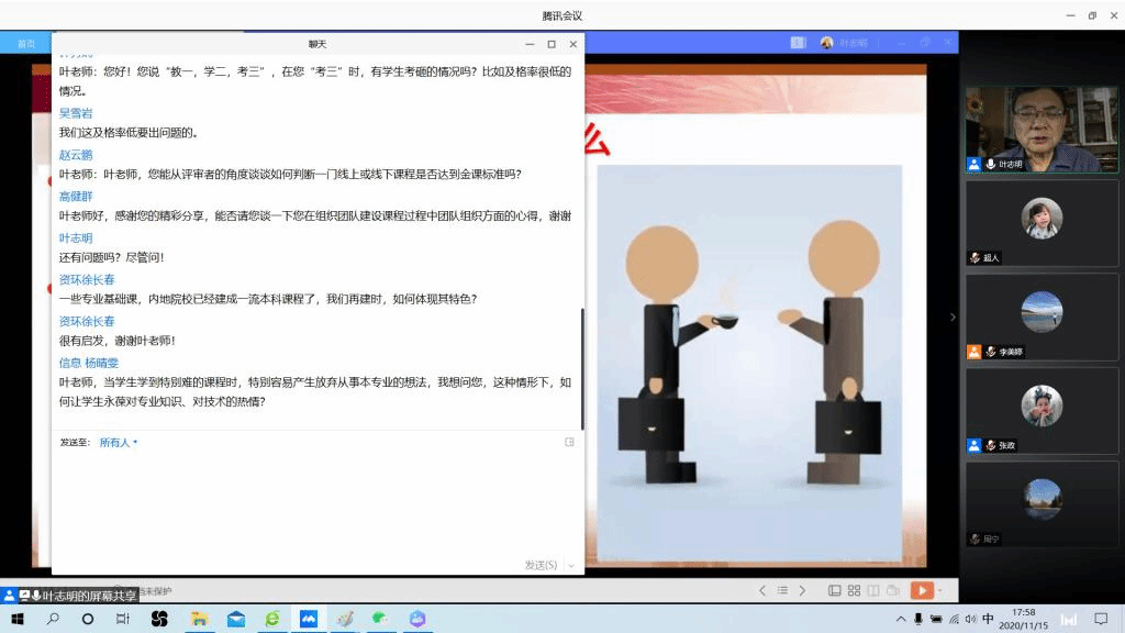 叶老师结束分享后和老师们的进行交流,聊天区老师们发言活跃,会场气氛热烈。“叶校长,辛苦了,非常受启发!”“叶校长的讲的太精彩了,对于目前我们面临一流课程建设的‘惑’,真是场‘及时雨’”“叶老师的教学处处有思政,很受启发,润物无声,课程思政”“非常受教,坚守初心,高山仰止,叶校长的讲座太精彩啦!”老师们不停的表达着收获和喜悦之情。