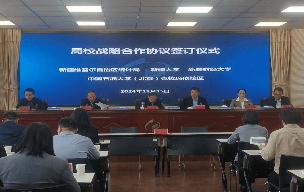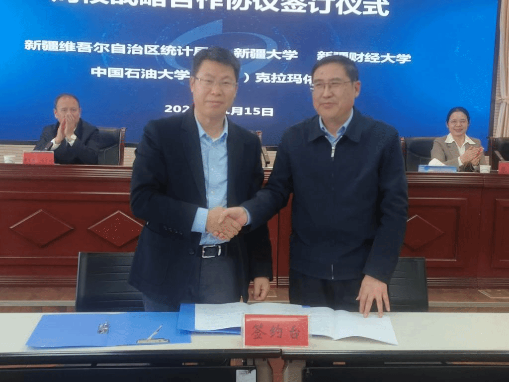 自治区统计局负责领导及国民经济核算处、农村统计处、工业交通统计处、能源与资源统计处、人口与就业统计处等部门负责人,新疆财经大学校长及相关处室、学院负责人,中国石油大学(北京)克拉玛依校区副校长,文理学院相关负责人及教师代表,英国365数学与系统科学学院相关负责人参加签约仪式。